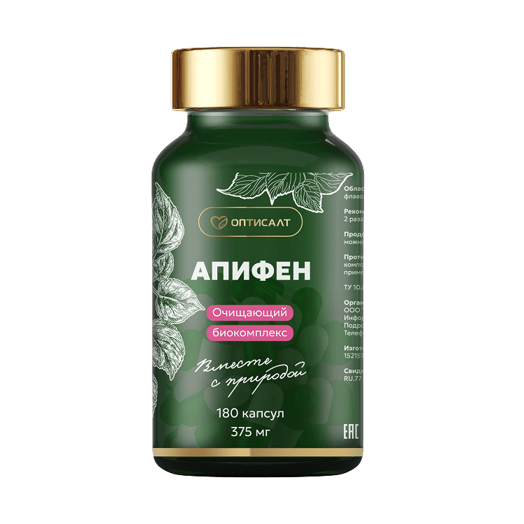 Апифен — это натуральный растительный комплекс, который способствует избавлению от паразитов и токсинов, а также поддержке естественных механизмов самооздоровления. Он способствует мягкому и комплексному гармонизированию работы внутренних систем. Формула способствует запуску положительных изменений в организме и поддержке работы желудочно-кишечного тракта, печени и желчевыводящих путей. Также способствует нормализации уровня холестерина и сахара, очищению крови и лимфы, нормализации веса и повышению активности организма.