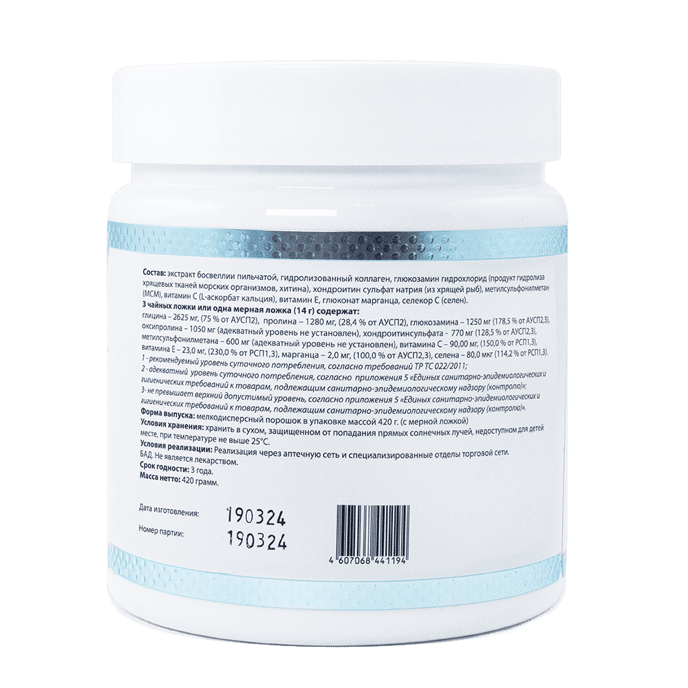 Показания к применению: чувствительность на холод при изменении погоды, утренняя скованность, боль при движении, ночная боль и боль в состоянии покоя, боль в мышцах, боль в спине и позвоночнике, чрезмерная нагрузка на суставы и позвоночник, повреждение тканей суставов и позвоночника, спортивные травмы, семейный анамнез остеоартроза или остеопороза, врожденное отклонение в положении тазобедренных, коленных и других суставов, реабилитация после травм и операций. Используется в качестве биологически активной добавки к пище и является источником коллагена, глюкозамина, хондроитинсульфата, дополнительным источником витаминов С и Е , марганца и селена.